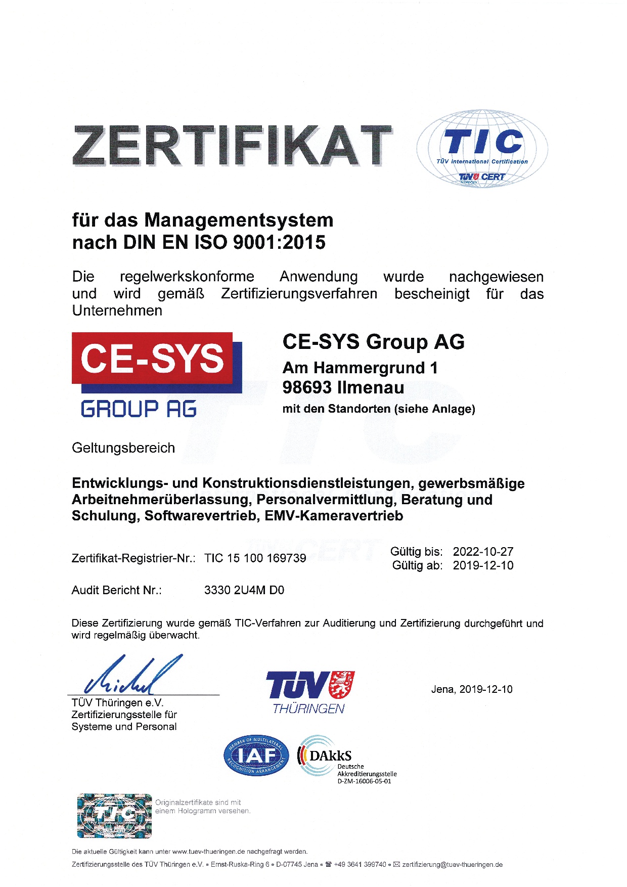 Qualität steht bei uns an erster Stelle. So ist unser Qualitätsmanagement nach ISO 9001 zertifiziert, um eine dauerhaft hohe Qualität unserer Dienstleistungen und Prozesse im Interesse unserer Mitarbeiter und Kunden zu gewährleisten.